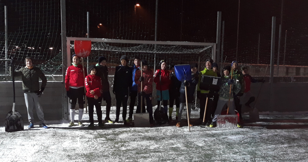 Sneg, ki je pobelil igrišča z umetno travo v ŠP Zarica so danes ekipe mlajših selekcij s trenerji očistili z igrišča. S tem so omogočili nemoten potek treningov v zimskem času.